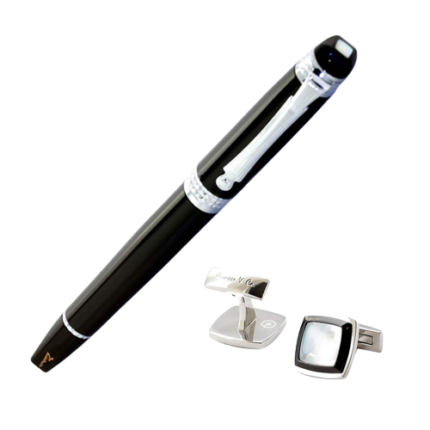 pen: Ballpoint pen crafted in silver-plated brass with black lacquer.